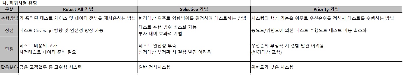 확인테스트와 병행해서 회귀테스트를 진행하는데 일반적으로 Selective 기법만 알고 있었지만 두개가 더 있다는 것에 참고해서 진행하면 더 완벽한 회귀테스트가 진행될 것으로 예상이 됩니다.